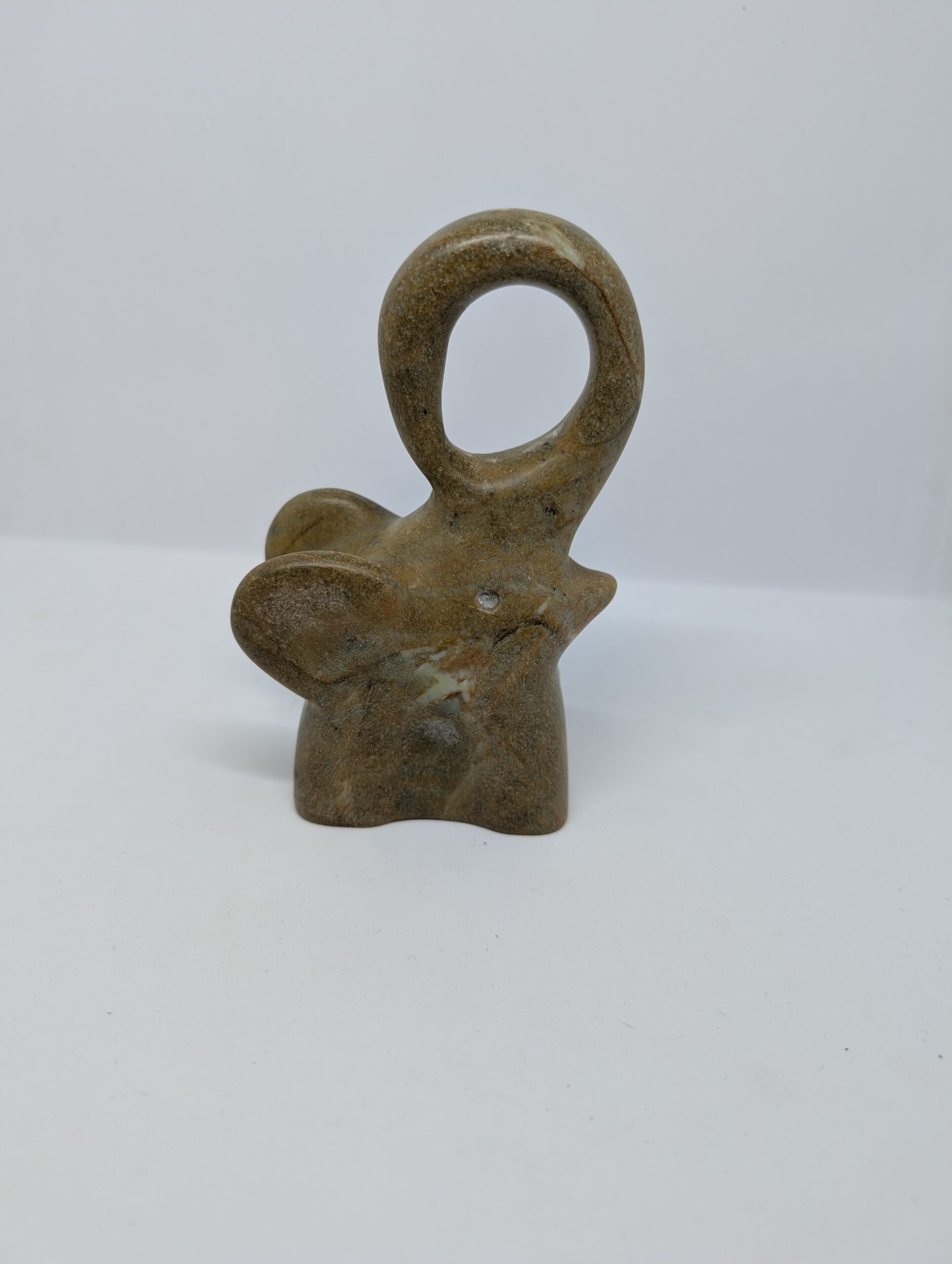 This carved soapstone figure is made from Canadian soapstone (also called Canadian steatite or Quebec soapstone), most likely originating from the Cassiar or eastern Quebec deposits.
